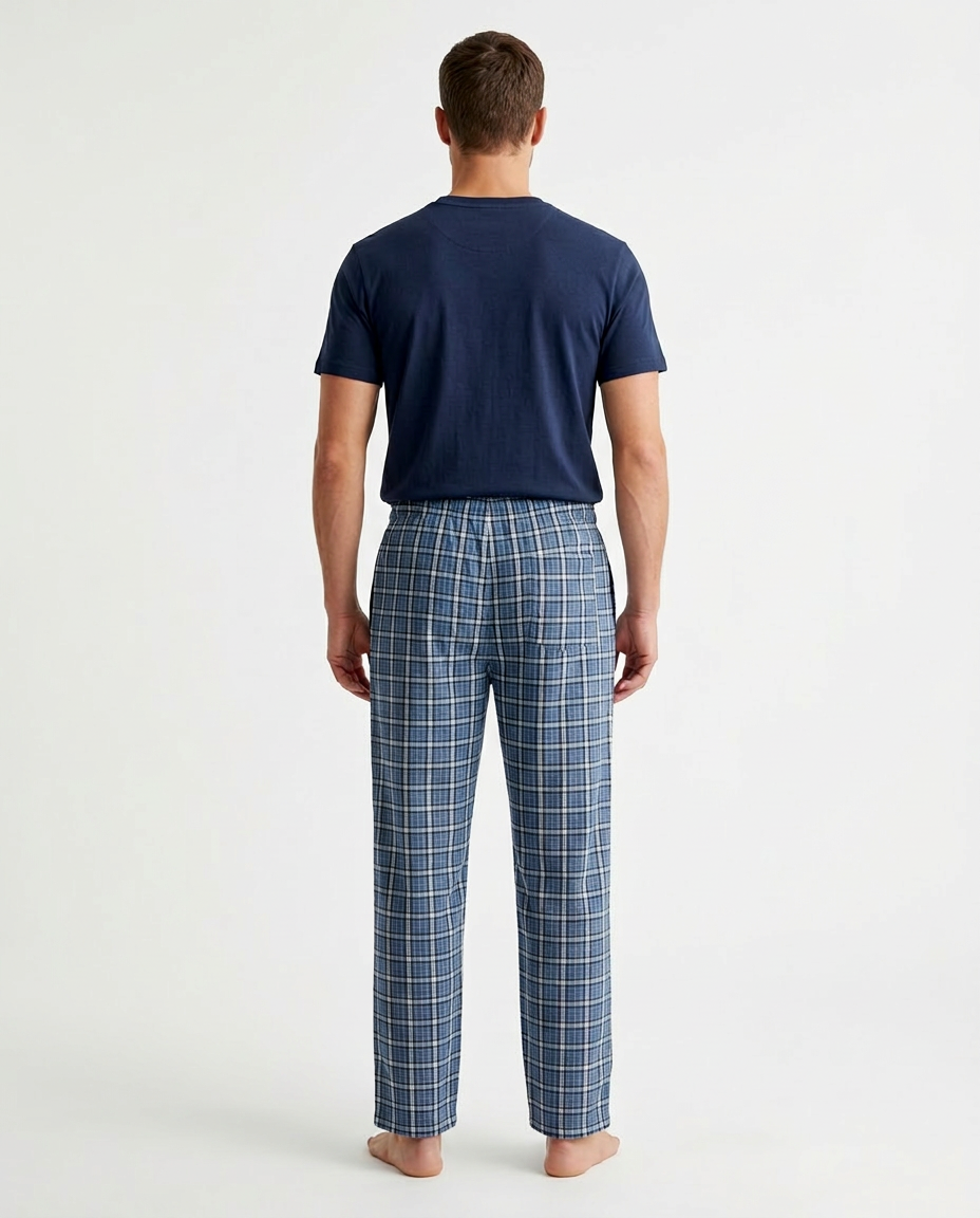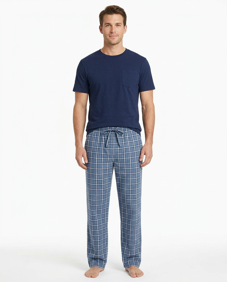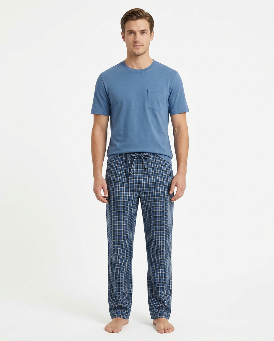 بيجامة رجالية بتصميم عصري تجمع بين الراحة والأناقة. مصنوعة من قماش مريح وخفيف مناسب للنوم والاسترخاء في المنزل.