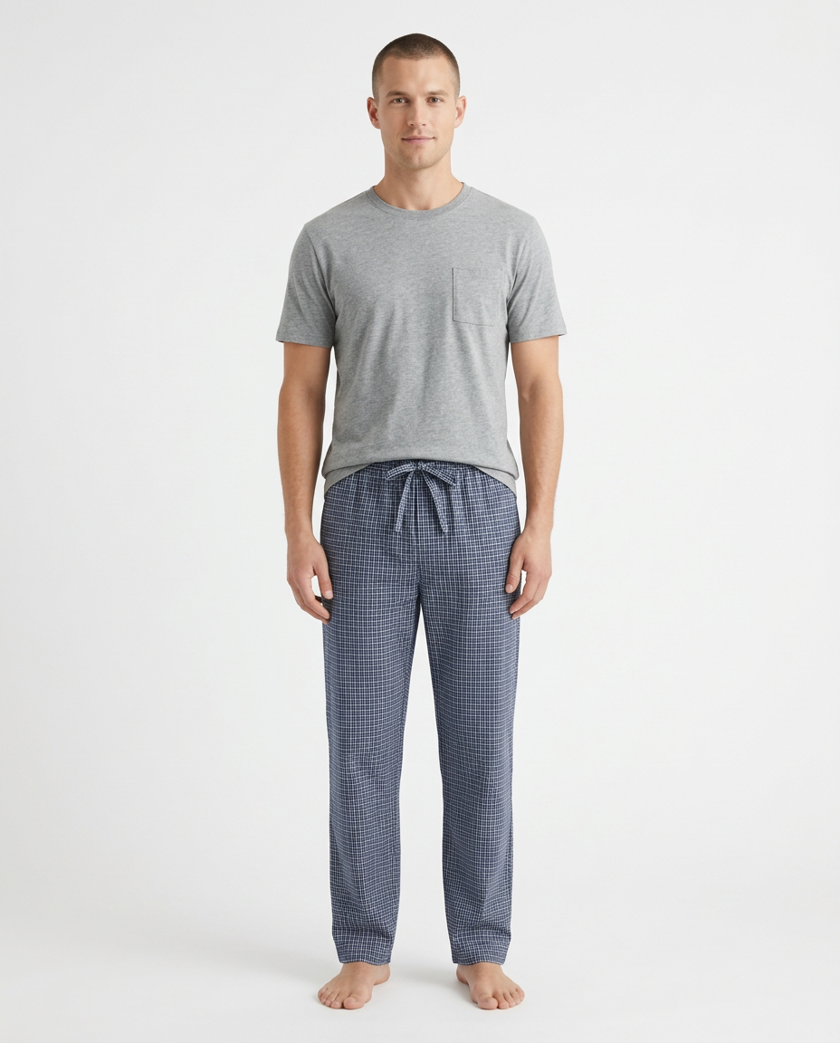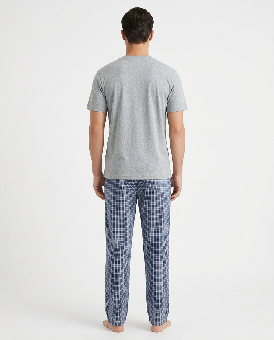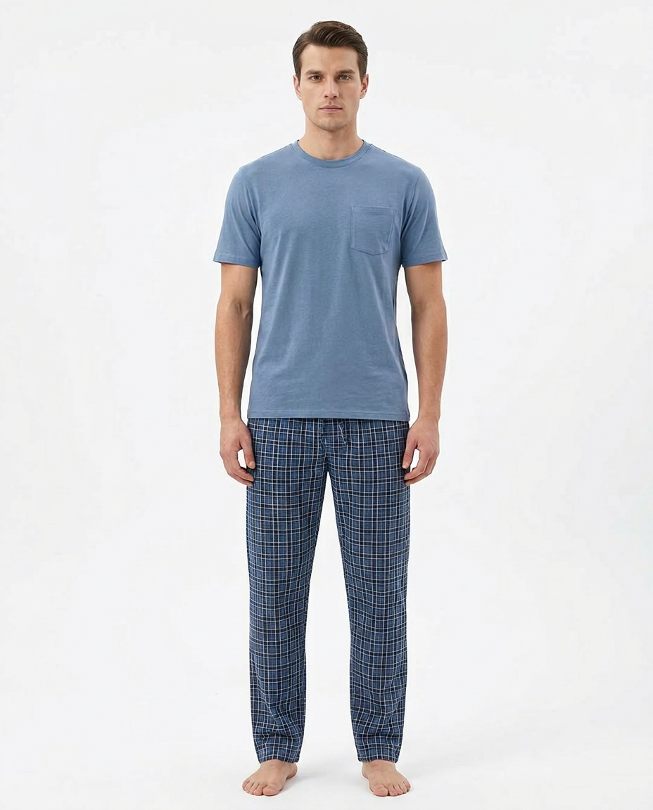 بيجامة رجالية بتصميم عصري تجمع بين الراحة والأناقة. مصنوعة من قماش مريح وخفيف مناسب للنوم والاسترخاء في المنزل.