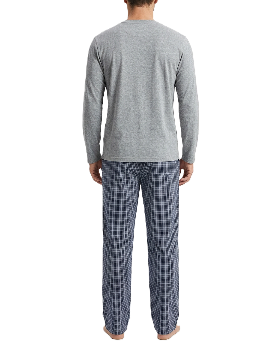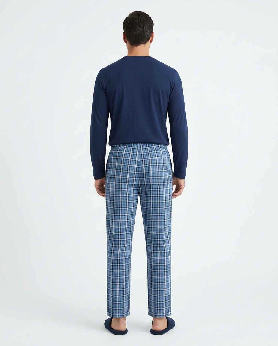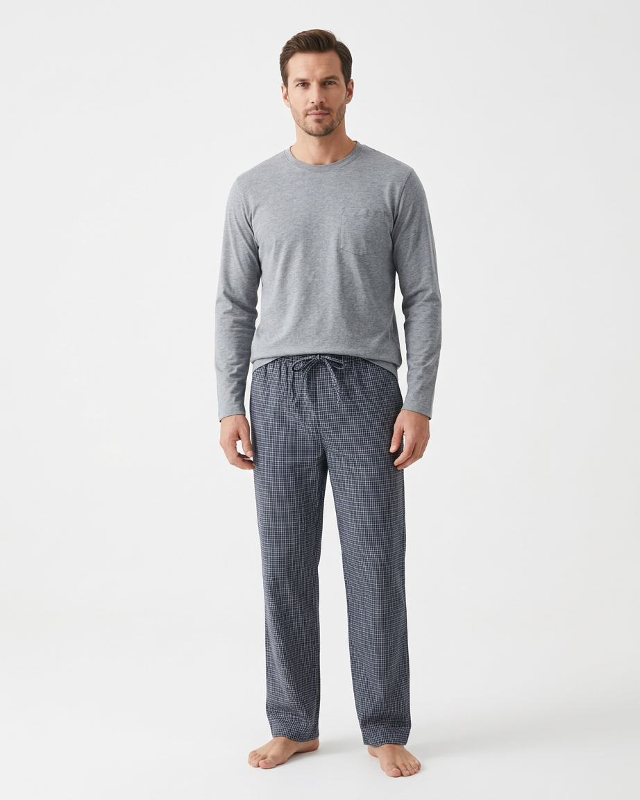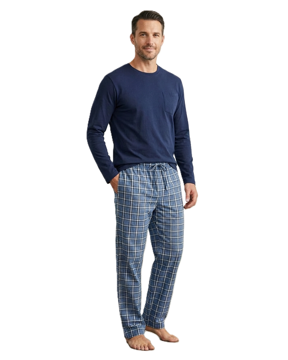 بيجامة رجالية بتصميم عصري تجمع بين الراحة والأناقة. مصنوعة من قماش مريح وخفيف مناسب للنوم والاسترخاء في المنزل.